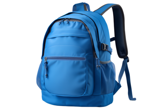 Blue backpack on transparent background, stylish rucksack for travel, cutout