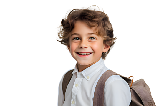 Smiling boy with backpack isolated on white background. Cheerful student portrait for education, back to school, or youth themes.