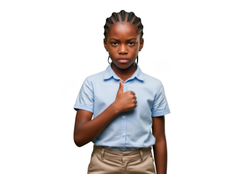 an african american young small schoolgirl make fingers thumbs up smiling at camera on transparent background