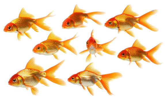A school of silver fish swimming together in a tight formation against a transparent background space filling