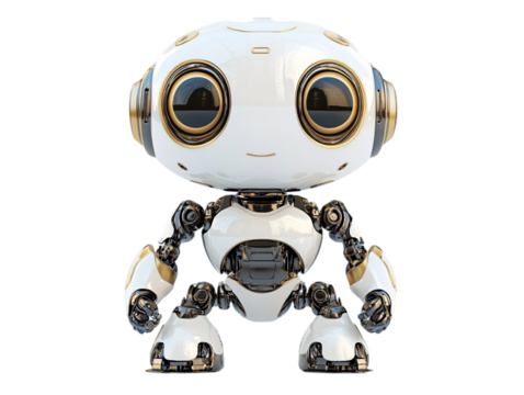 A compact, friendly robot with large eyes and a sleek white and metallic body on transparent background.