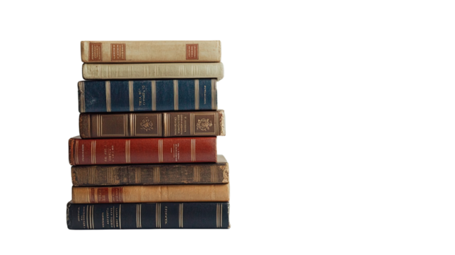 Tall stack of classic books on transparent background