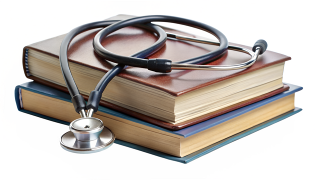Stethoscope resting on a stack of books isolated on transparent background, symbolizing medical knowledge, education, and the pursuit of healthcare expertise