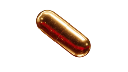A single, shiny, metallic capsule with a reflective surface, isolated on black