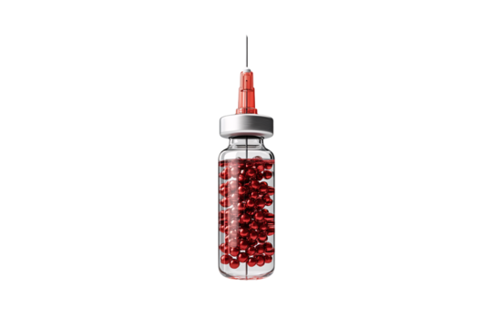 Transparent syringe filled with suspended red beads, creating a futuristic, scientific or medical concept visual, isolated on a transparent background