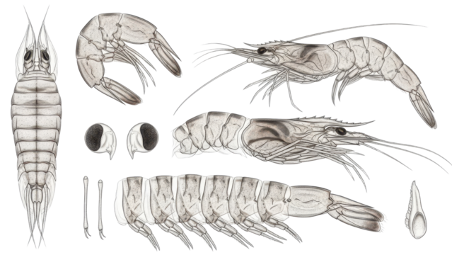 Detailed Scientific Illustration of Shrimp Anatomy and Life Cycle Stages isolated PNG with Transparent Background