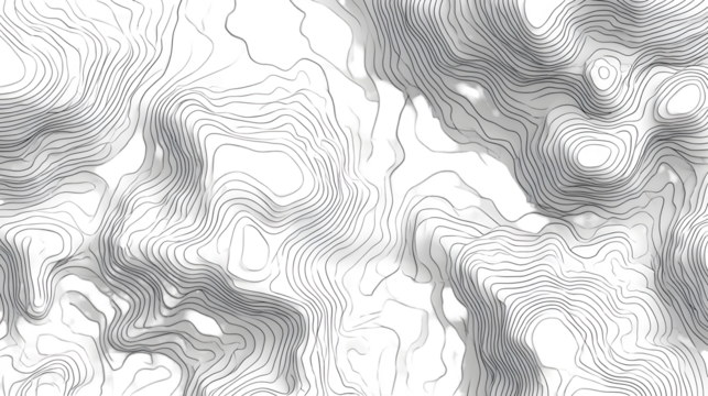 A black and white abstract topographic map with contour lines and varying elevations