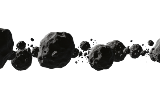 Dark, jagged asteroids and scattered debris of varying sizes, exhibiting clear contours, suspended and drifting against a pristine clean white background with no shadows. Scientific visualization of