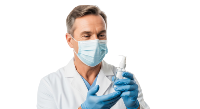 Healthcare professional wearing mask and gloves holding a vaccine vial isolated on transparent background