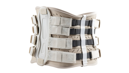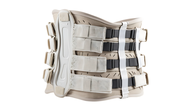 Orthopedic corset on female body, back support belt for good posture, posture correction, treatment of spinal curvature, back pain relief, close up on transparent background