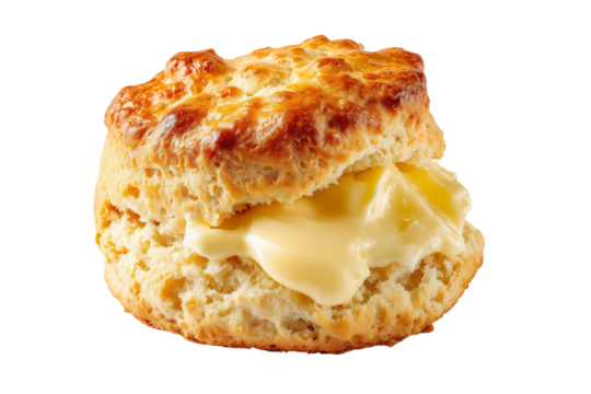 Golden brown buttered scone with a glossy crust isolated on white background.
