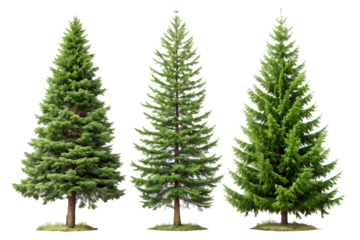 highly detailed photorealistic set of individual evergreen coniferous trees (pine, fir) with lush emerald foliage and textured brown bark, isolated on a transparent studio background. concept for