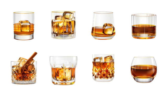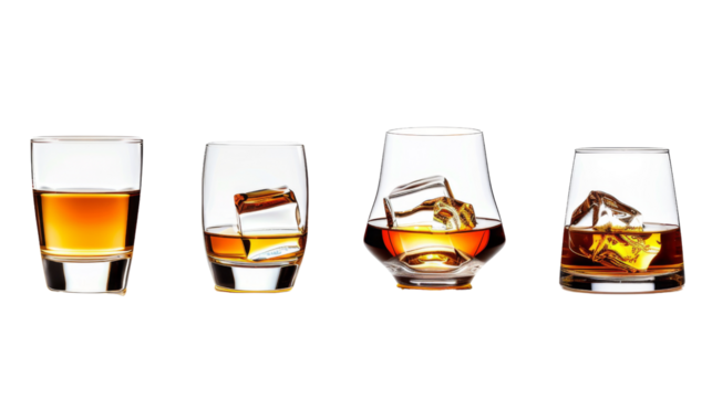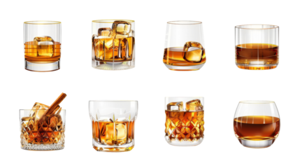 Set of glass of whiskey or whisky or american Kentucky bourbon with its reflection on the plane. isolated on transparent background