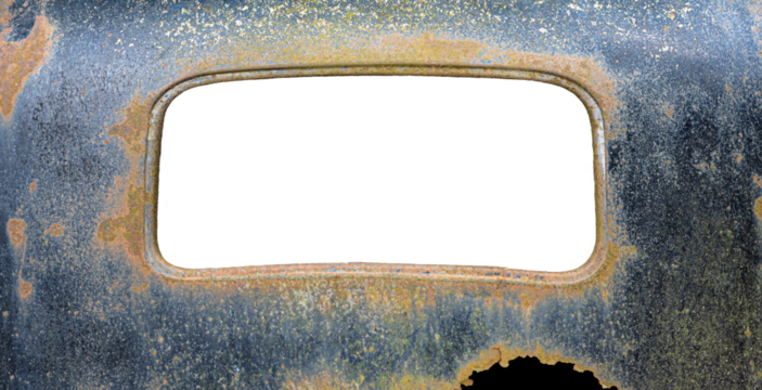 Abandoned old rusty car window with a transparent or white cut out. Retro vintage scrap metal mock up background