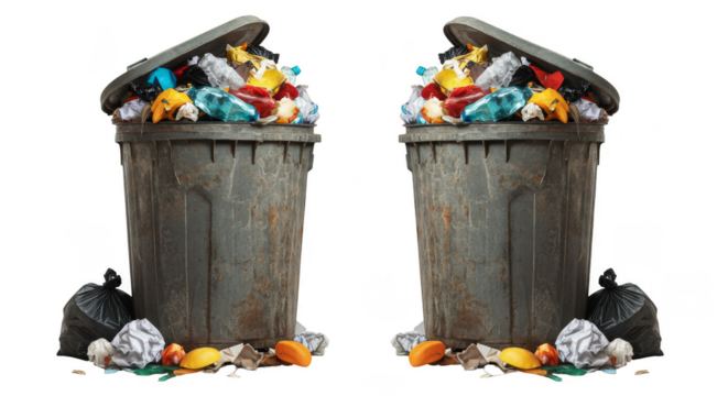 Realistic Illustration of Two Full Trash Cans Overflowing Waste Debris