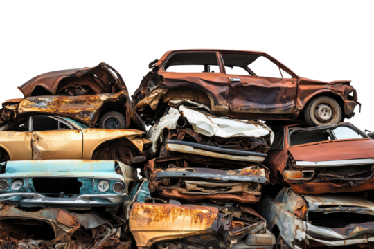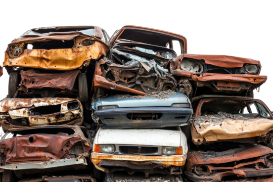 Old Rusty Junk Cars Stacked in Scrap Yard isolated on transparent white background, clipping path
