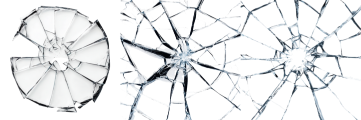 Glass breaking, creating a shattered impact with radial cracks and a clear bullet hole mark on transparent background