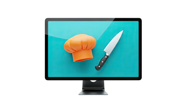 Computer screen displaying chef's hat and knife on teal background