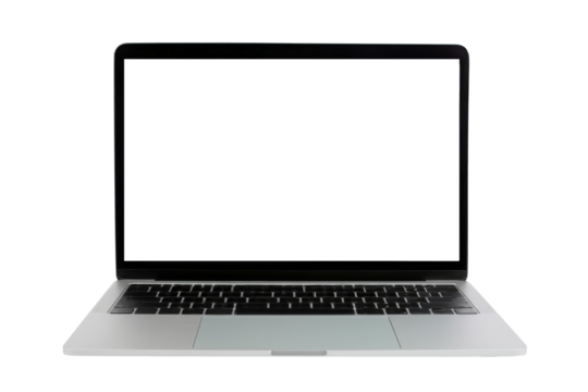 Front view of a modern generic silver metallic laptop with a blank black screen and isolated on a transparent background.