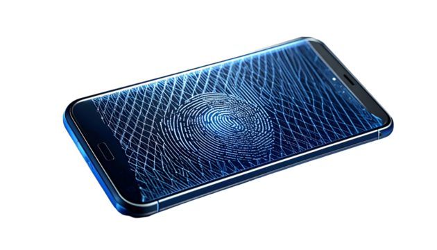 Smartphone displaying digital fingerprint scan, illuminated, black background
