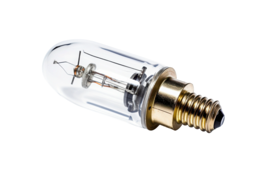 A single incandescent light bulb with a brass screw base isolated on transparent background