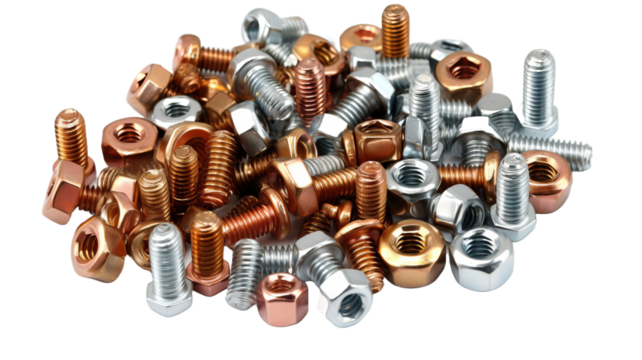 Many metallic screw heads, nuts, rivets isolated on white background close-up macro color copper and silver isolated on white background