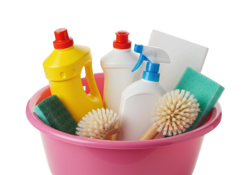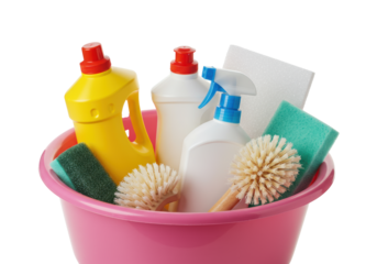 High-key studio shot of vibrant pink plastic basin holding yellow detergent, blue spray bottle, and white brush on a transparent background, soft drop shadow. Concept for domestic cleaning advertising
