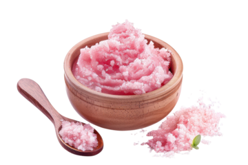 Vibrant pink sugar scrub in a wooden bowl with a natural wooden spoon on a white background