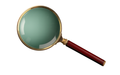 A hand holds an ornate gold magnifying glass against a transparent background for examination and investigation