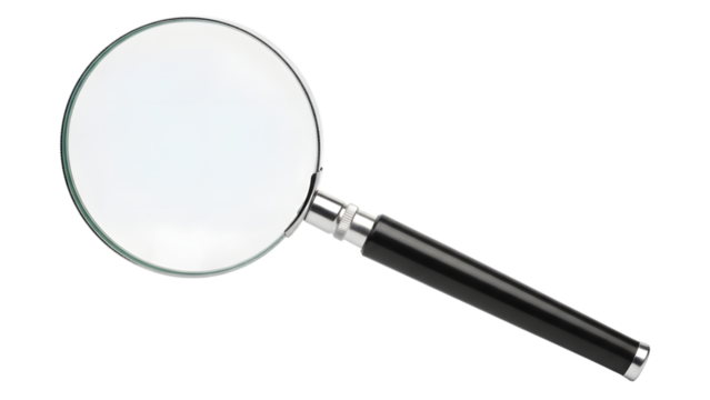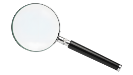 Magnifying glass with black handle and silver accents isolated on a transparent background inspection