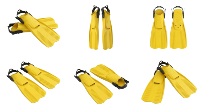 Set of yellow swimming fins with adjustable straps isolated on transparent background for water