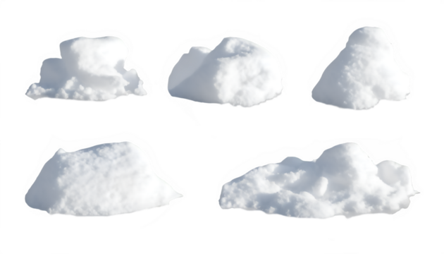 Five abstract white sculptural forms with textured surfaces