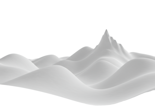 Conceptual 3d render of pristine, undulating snow drifts and a sharp mountain peak, soft studio light revealing sculptural white forms against an infinity background. Concept of minimalist elegance