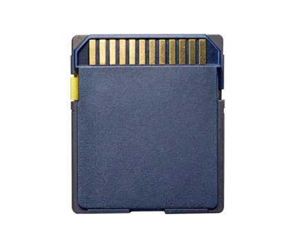 Close-up of an sd card resting on a transparent background, showcasing its compact design and data storage capabilities