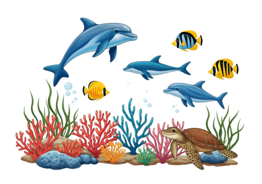Vibrant pixel art coral reef ecosystem teeming with diverse marine life and colorful anemones