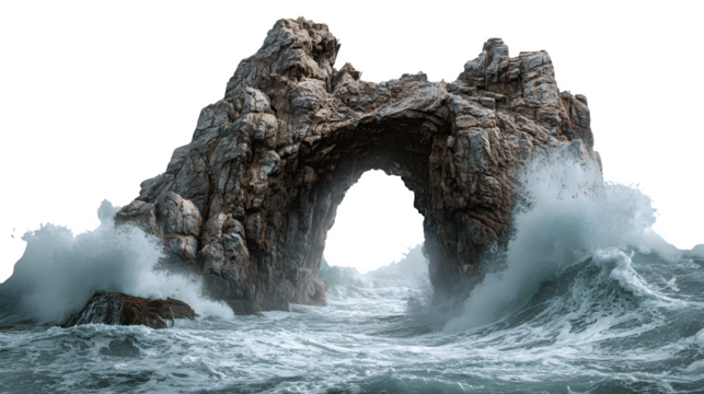 Natural rock arch formation standing in ocean water with waves breaking around its base, transparent background