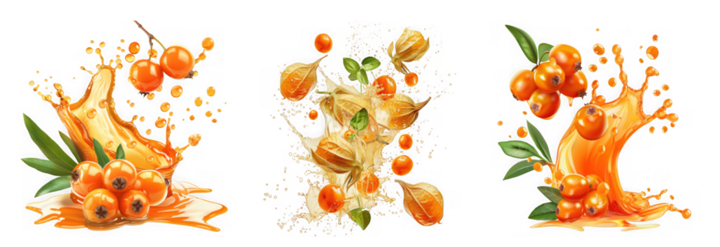 A mix of sea buckthorn and physalis fruits splash in juice isolated on transparent background