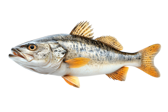 Sliced ​​white sea bass with yellow lemon cut out isolated transparent background