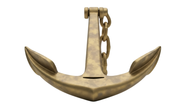 Isolated bronze anchor with chain for marine navigation and seafaring on a plain background