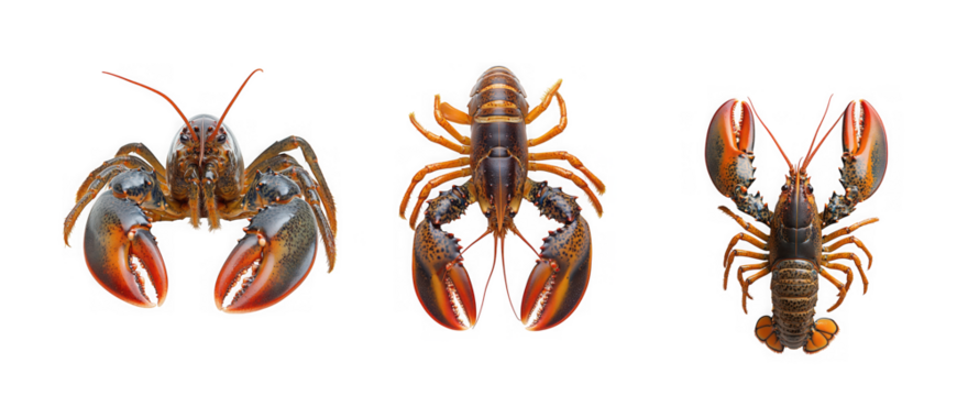 Detailed illustrations of three lobsters in various poses showcasing vibrant colors on transparent background high quality
