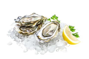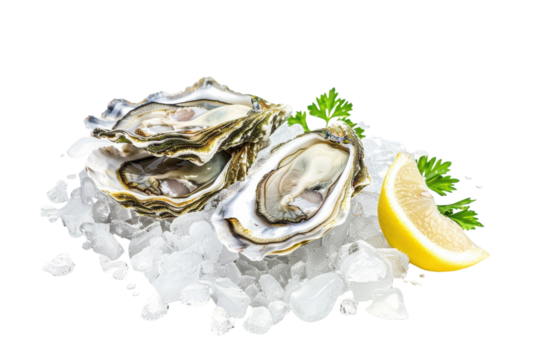 Fresh oysters with lemon and parsley on ice, gourmet seafood