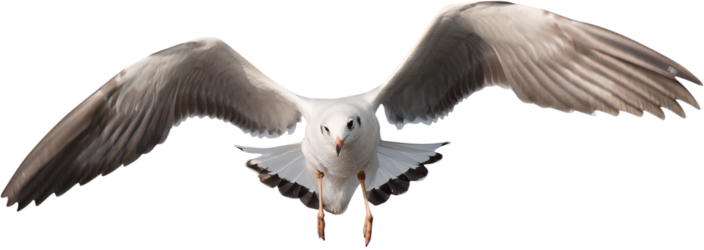 a seagull in mid-flight. showcasing its wings spread wide and feathers detailed against a white background the bird's sharp gaze and distinctive beak highlight its natural beauty. emphasizing its role