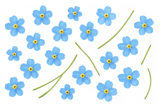 Delicate forget-me-not flowers scattering, seamless blue floral pattern on transparent background, spring nature design