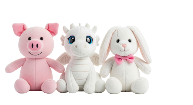 soft studio light illuminates a pink piglet, white dragon, and bunny plush toys sitting on a transparent surface with copy space, concept of childhood toys advertising