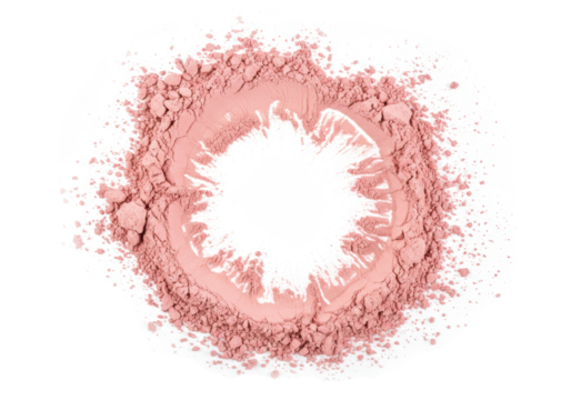 Ultra-fine, delicate blush pink powder with granular texture and soft, diffused edges, forming an incomplete circle on a transparent background with copy space, concept of purity and delicate