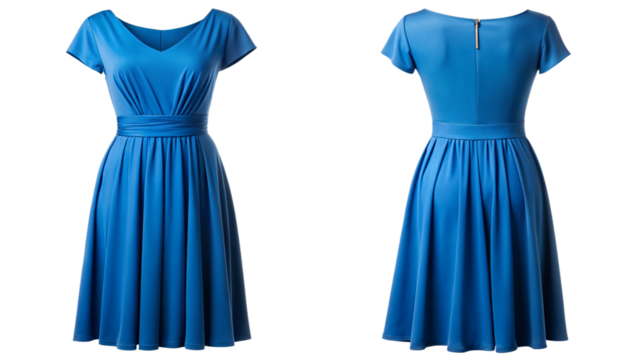 Elegant blue dress front and back view for mockup isolated PNG on transparent background
