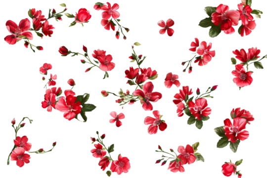 Falling flowers with red petals in the air, spring season placed on white or transparent background