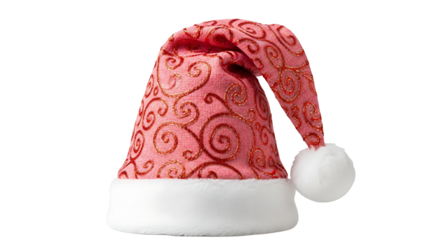 A unique light red Santa Claus hat with a delicate floral pattern, isolated on a transparent background for Christmas design.