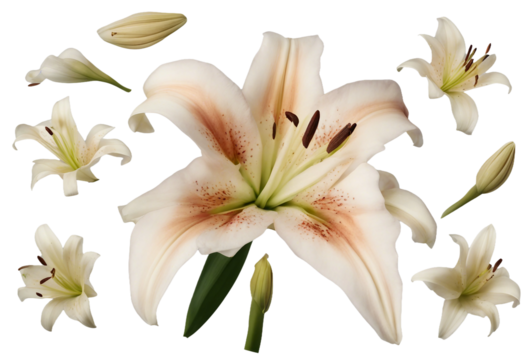 Set of springtime lily flowers and petals isolated on transparent background various size