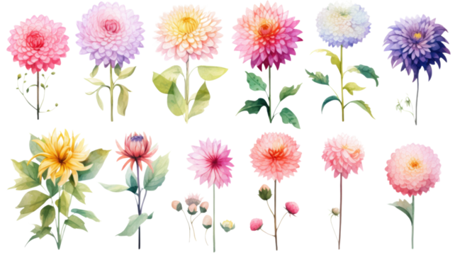 a collection of soft watercolor dahlias flowers isolated on a transparent background, generative ai
